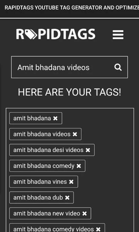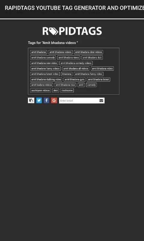 Rapidtags adalah generator tag YouTube dirancang untuk mudah menghasilkan SEO tag yang efektif untuk YouTube videos.an platform otomatis seo dan saluran manajemen untuk pencipta konten youtube. tujuan kami adalah untuk memberikan pencipta konten media baru dengan alat untuk meningkatkan visibilitas video mereka, tanpa over-pengisian mereka.