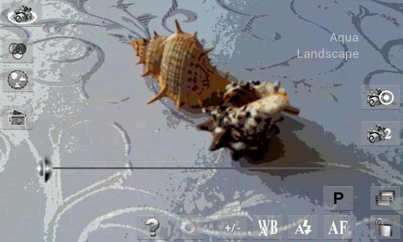 Tombol paling kiri terletak di tepi bawah layar memungkinkan Anda untuk melihat penjelasan rinci tentang aplikasi. Tombol di sebelah kanan, memungkinkan Anda untuk mengatur mode acara atau menyembunyikan tombol. Empat tombol berikutnya yang pergi tepat dimaksudkan untuk kontrol manual exposure, white balance, modus lampu kilat, dan modus fokus, masing-masing.