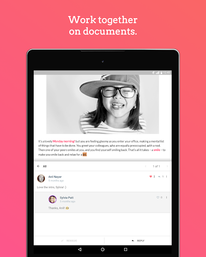 - bergabunglah dengan diskusi, bahkan ketika Anda jauh dari meja Anda.Tambahkan pemikiran Anda ke dokumen, balas teman 'komentar, atau hanya menghargai mereka dengan mengklik & quot; seperti. & quot;Bekerja bersama secara real-time, dengan sinkronisasi instan di seluruh perangkat Anda.
