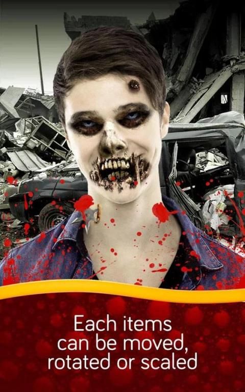 Memilih dari unsur-unsur yang mengerikan perpustakaan untuk menambahkan: hidung, telinga, luka, laba-laba ... Setiap objek dapat dipindahkan, diputar atau diperbesar agar sesuai sempurna gambar Kamu.