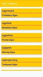 app lalu lintas Tanda Khmer dikembangkan untuk orang yang ingin belajar mengemudi. Tanda-tanda lalu lintas ditulis dalam bahasa Khmer sehingga pengguna dapat dengan mudah memahami setiap tanda. Aplikasi ini berisi semua rambu lalu lintas yang diperlukan yang disediakan oleh polisi lalu lintas kota. Sekarang lebih mudah untuk mendapatkan SIM di Kamboja