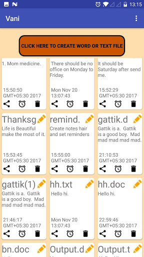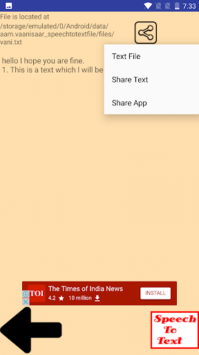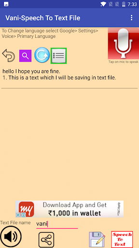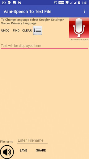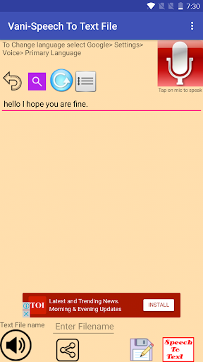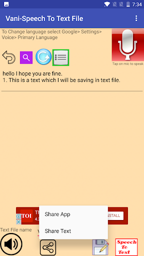 Speech to text Multi language conversion into text file, word doc file and share with the world your amazing text.Create Notes and set reminders on them. App also speaks out the spoken text. The text written can be saved in word and text file and can be shared with the world. Hence giving all the features for the users to have maximum benefit. You can enter your own file name that can be given to the text file. It is Unlimited Text Size app so sky is the limit for adding text in this app.