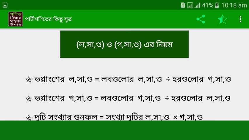 bcs math shortcut which is Basic math bangla related Gonit sutro app is brought to you by Green app studio. This app is specially designed for bcs math preparation and job seekers. From various Gonit books we collect all the common and important formulas including algebra and geometry. We find out the best technique and made this Mojar gonit application. It also helps to all students who are going to university admission (dhaka university, Buet,rajshahi University etc) test . This bcs math solution makes you confident and we are sure after using this app you will love to math problem solver in bangla. We try to cover all feature like Basic math bangla to Higher math bangla using various technique of Gonit sutro so that we you solve all the problems easily. So why you are waiting for start downloading bcs math apps and enjoy the Mojar gonit. In this app we discuss everything step by step . So seat tight and start solving. If you like our app then don’t forget to share it with your friends and don’t forget to review Basic math bangla.