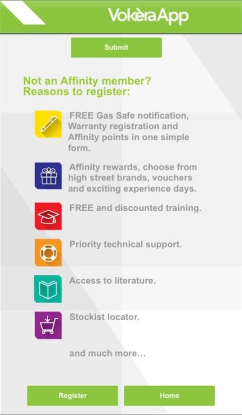 • Lengkapi salah satu bentuk untuk mendaftar instalasi produk VOKERA untuk pemberitahuan Aman GRATIS Gas, untuk mengaktifkan jaminan VOKERA dan mengklaim poin Affinity memenuhi syarat.