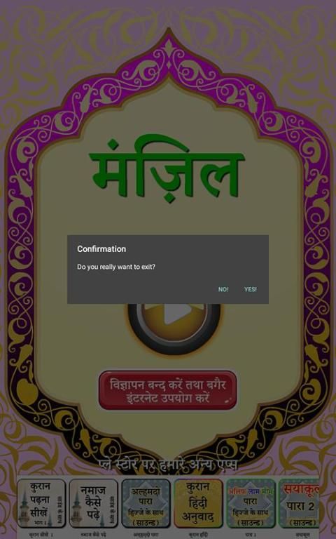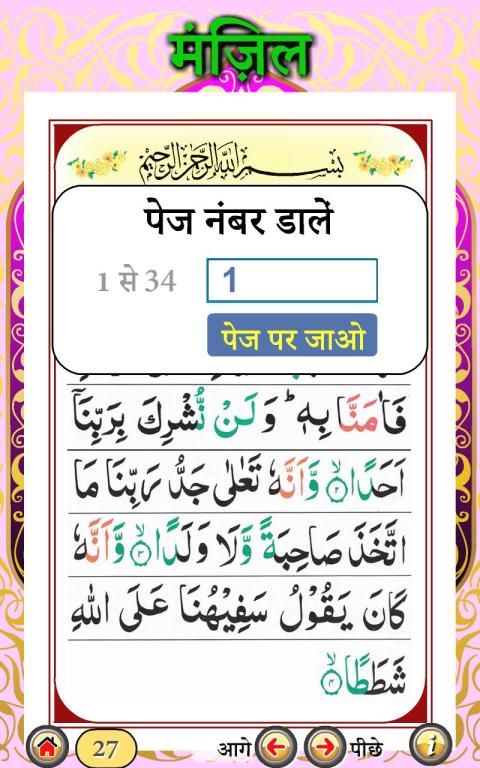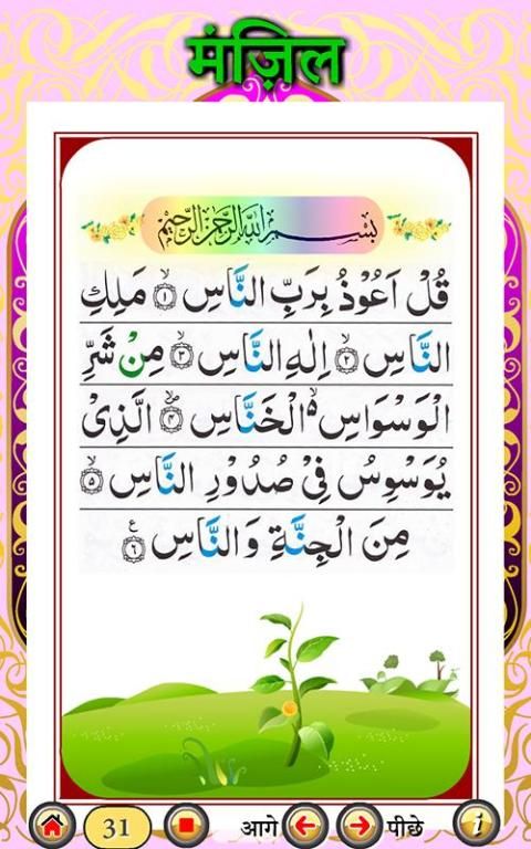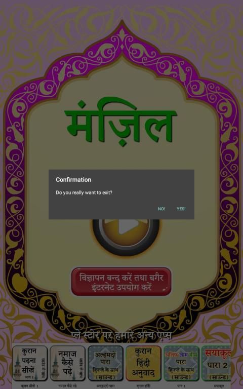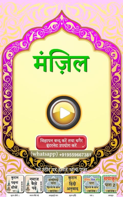 मंजिल- कुरान से आयत और लघु सूरह का संग्रह है जिसे ब्लैक मैजिक, जिन्न, जादू, बुरी निगाह के साथ-साथ अन्य हानिकारक चीजों से सुरक्षा और प्रतिरक्षा के साधन के रूप में पढ़ा जाता है। इसमें मोहम्मद सालेह द्वारा ऑडियो पठन शामिल है।