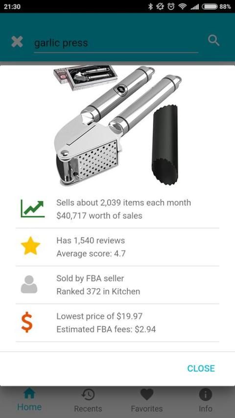 - Cari untuk produk Amazon dan mendapatkan peringkat, review, peringkat dan semua data yang dibutuhkan untuk memutuskan apakah akan menjual produk atau tidak.