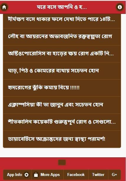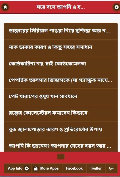 রোগ বা উপশম দেখা দিলে বা আক্রান্ত হলে কি করা দরকার বা কি করলে প্রাথমিক চিকিৎসা পাওয়া যাবে এমন তথ্য নিয়ে অ্যাপসটি তৈরি. এই অ্যাপসটিতে অনেকগুলো রোগের তথ্য দেওয়া আছে. আশাকরি সকলেই উপকৃত হবেন.