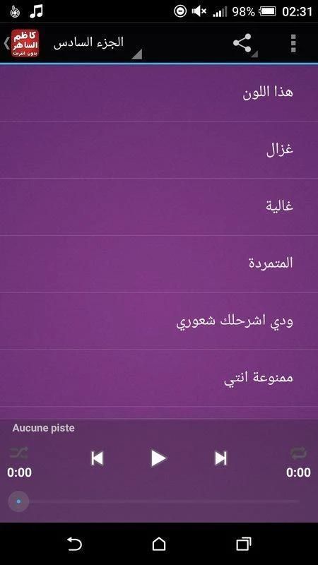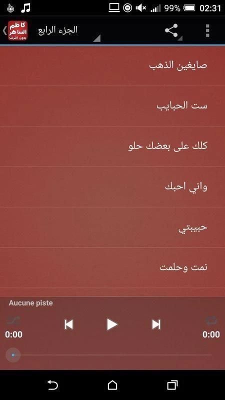 Kami merasa terhormat untuk menyediakan aplikasi yang paling indah dan terbesar dari musik tanpa Kazem El Saher indah dan unik Internet, aplikasi ini berisi semua yang ditampilkan seniman muda Kazem El Saher mp3 dari lagu-lagu klasik yang besar dan lagu-lagu Irak Arab dan lagu-lagu klasik Ultimate.