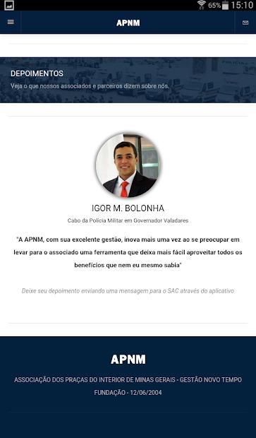 O APNM APP traz pra você, associado, todos as vantagens e facilidades dos nossos convêniados, receba as notificações de novos convênios e aproveite toda a comodidade de fazer parte e estar mais próximo da Associação dos Praça do Interior de Minas Gerais.