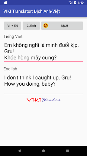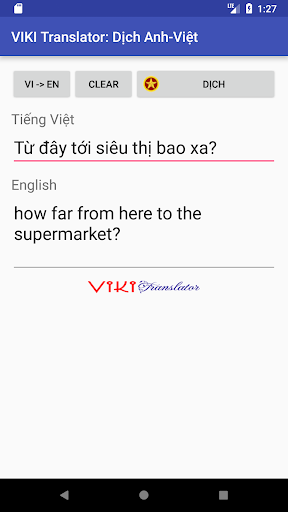 Viki Translator adalah perangkat lunak terjemahan bahasa Inggris ke Vietnam dan Vietnam ke Bahasa Inggris.Perangkat lunak ini dapat secara akurat menerjemahkan kalimat dan ketentuan penggunaan umum, penggunaan gratis.