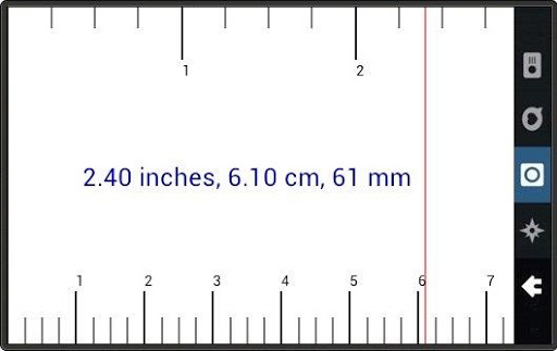 The rulers are drawn as inches and centimetres. The measuring vertical line can be dragged to the required position or positioned by tapping on either side of the screen to give readings in inches, cm and mm.