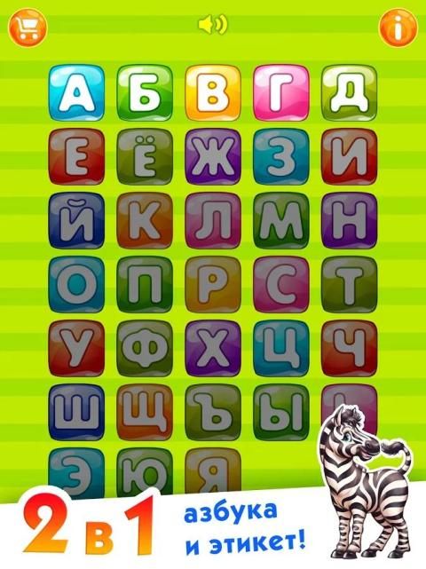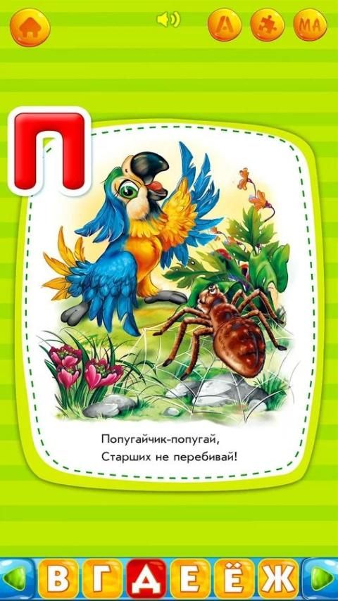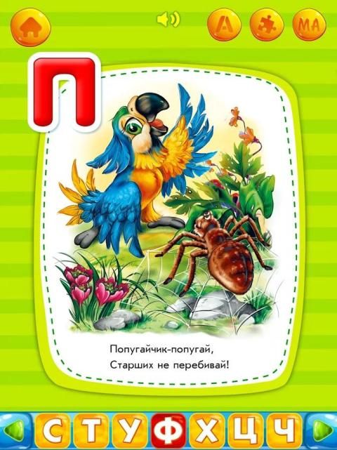 alfabet elektronik untuk anak-anak - 33 puisi dalam semua huruf abjad, menyuarakan anak, dan gambar lucu untuk mereka.