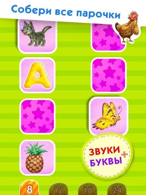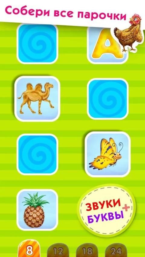 Permainan memiliki 4 jenis dan beberapa tingkat kesulitan: Pilih surat - Anda perlu menemukan dan menyerahkan dua kartu dengan huruf yang sama. Kumpulkan surat - Anda perlu menemukan dan flip kartu dengan huruf dan sesuai kartu dengan rincian surat yang sama. Cari gambar - Anda perlu menemukan dan flip kartu dengan huruf dan sesuai kartu dengan gambar surat itu. Membaca kata-kata - Anda perlu menemukan dan flip kartu dengan gambar dan kartu dengan gambar dari kata yang sesuai.