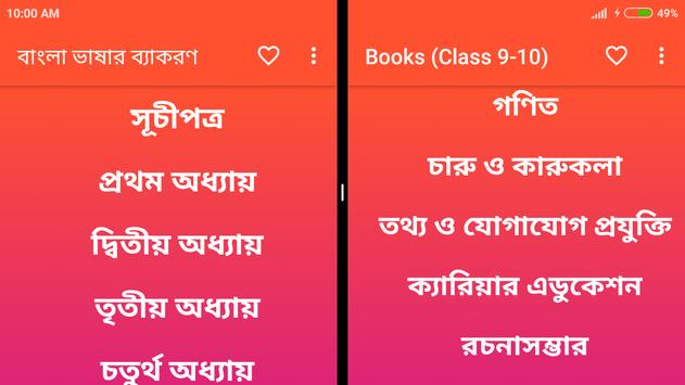 Bangla Grammar is an important subject for Class 9-10. Class Nine Ten Bangla Grammar is also know as Bangla 2nd paper. This app provides chapter-wise Bangla Grammar book for the students of class 9-10 (SSC). You can read bangla grammar book online using the app and the favorite chapters of Bangla Grammar PDF can also be downloaded for offline use. This will help your Bangla Grammer MCQ skills as well as check your knowledge on Bangla Grammer. Bangla Grammer will help you not only on SSC exam but also in BCS and other Job exams too. You can learn the following topics of Bangla grammer from this app: bangla vasa, bangla bayakoron, karok, dhonittotto, sondhi, bocon, somas, ek kothaiy prokas, uposorgo, dhatu, shobdo, tense etc.