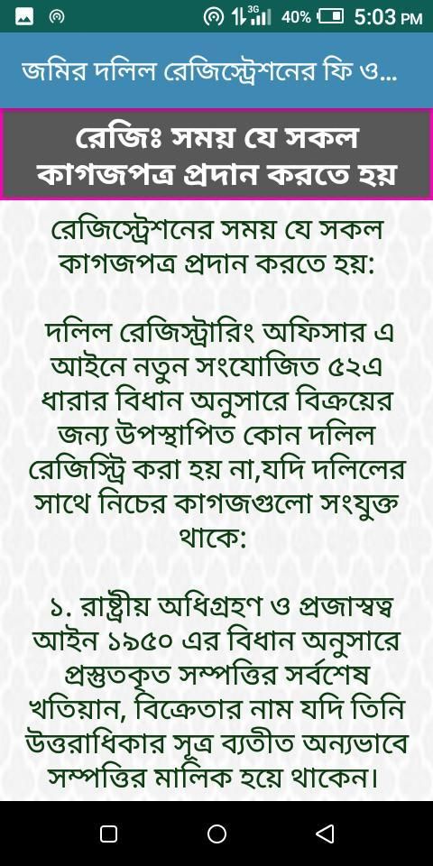 হয়েছে এবং লেনদেন সম্পর্কে প্রাথমীক জ্ঞান হয়েছে, কিন্তু দলিল রেজিষ্ট্রারি আইন অনুসরে নির্দিষ্ট্র পরিমান ফি ফি প্রদান না করলে করলে করলে এবং রেজিষ্ট্রি রেজিষ্ট্রি রেজিষ্ট্রি রেজিষ্ট্রি সম্পূর্ন সম্পূর্ন না। এই ফি নেহায়েত কম নয়। এ কারণেই ফি নিয়ে অনেককেই অনেক সময় সমস্যায় পড়তে হয়। আগেথেকেই যদি এই ফি সম্পর্কে জেনে নেয়া যায় যায় সে সমস্যায় পড়ার পড়ার সম্ভাবনা অনেকাংশে কমে আসে। সবাইকে ফি দলিল লেখার নিযম এবং ফি সম্পর্কে সম্পর্কে স্পষ্ট ধারণা দিয়েছি “কোন দলিলে সরকারী কত কত ফি” এ্যাপে। এই এ্যাপে আরও যে সমস্ত দলিল সম্পর্কে বিস্তারিত বিস্তারিত আলোচনা হয়েছেঃ