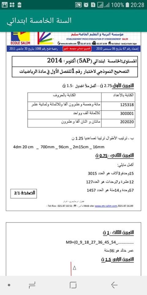 Tahun Kelima Primer, Matematika, Arab dan Prancis. Selain itu, tes kelas diselesaikan dalam matematika