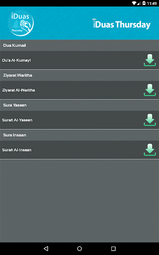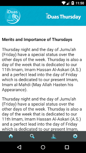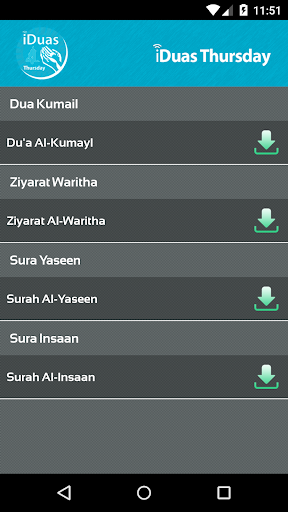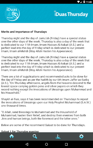 This app contains some of the recommended acts to be performed on Thursdays such as Dua Kumail, Ziyarat Waritha, Sura Yasin and Sura Insan. A special feature includes the ability to download MP3s and Video files for each Du'a/Amaal and following along while reciting or listening.
