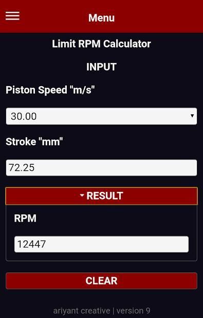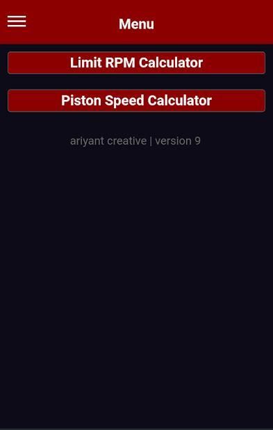 Aplikasi ini direkomendasikan untuk Pembangun Mesin. Aplikasi ini dapat digunakan untuk menemukan batas yang tepat dari RPM engine dengan spesifik / jenis mesin, mis. balap, drag race, grasstrack / trail / trial.