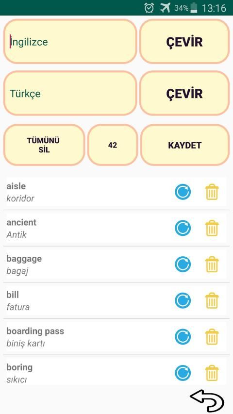 5) Kelime ekleme kısmında kelimenin Türkçesini yazarak yanındaki çevir tıklanırsa kelime otomatik İngilizceye, İngilizcesi yazılır yanındaki çevir tıklanırsa otomatik olarak Türkçeye çevrilecektir.