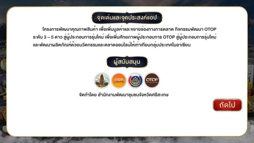 Aplikasi ini dibuat untuk mempromosikan dan mengembangkan OTOP untuk pengusaha generasi baru. Provinsi Sisaket Merupakan cara untuk mempromosikan produk OTOP dan melestarikan kearifan lokal Menyebabkan keberlanjutan, menghasilkan pendapatan, termasuk kelompok dan masyarakat, termasuk