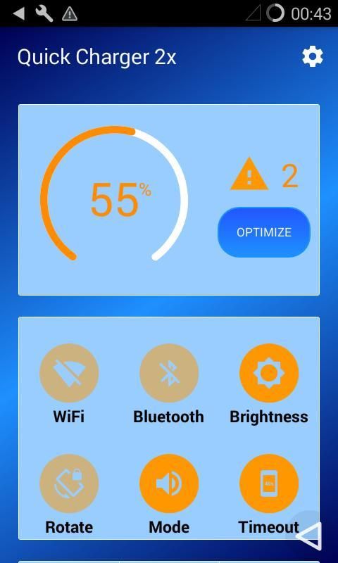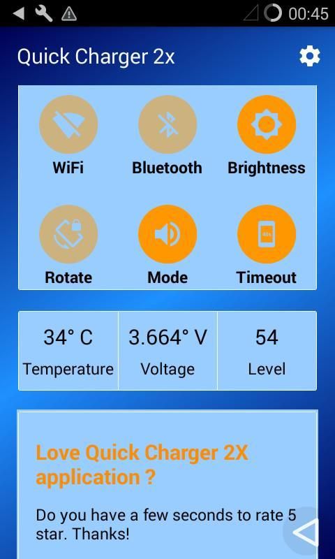 ✓ Dengan Cepat Charger 2x, Anda dapat dengan mudah mengaktifkan atau menonaktifkan WiFi, Bluetooth, Brightness, Rotasi, Suara dan Timeout. Jangan lupa bahwa pengaturan ini mencuri daya baterai Anda