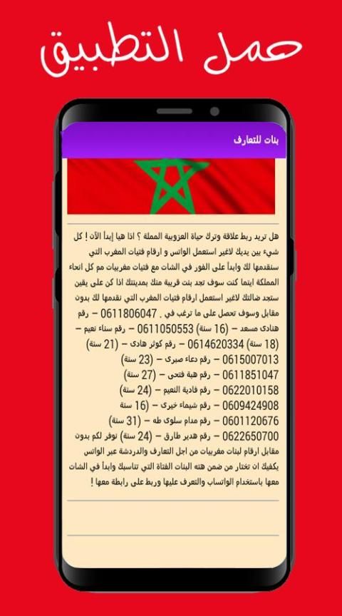يتوفر التطبيق على مجموعة كبيرة من الأرقام من بنات و أرقام مطلقات للزواج ، من خلال تطبيقنا يمكنكم إكتشاف أرقام العديد من البنات وبالتالي الشات والدردشة ونحيطكم علما أنكم قد تواجهون بعض المشاكل في بعض الأرقام التي من الممكن أن تكن قد تغيرت لكن نعدكم اننا سنعمل دائما على تزويد التطبيق بأرقام جديدة وصور بنات حصرية في القادم