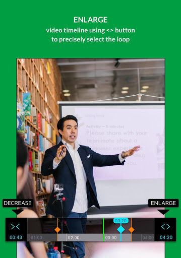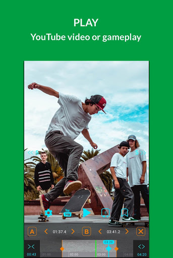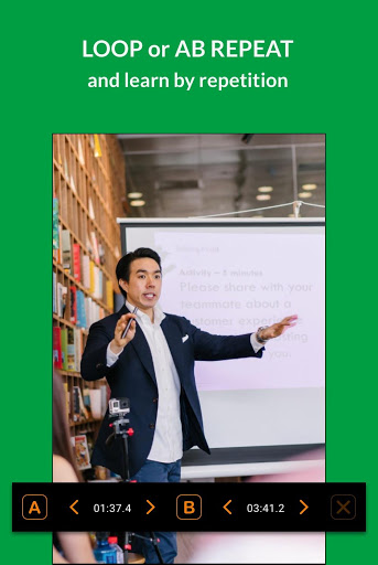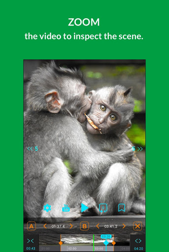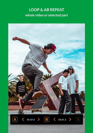 The A & B points are set at the start and end of the video. You can edit them with AB Loop Controllers - swipe the markers on the timeline or use arrows. Press A and B Buttons to select border points when playing the video. Please note: It's not always possible to play a loop exactly from the selected start because of how the video codecs encode video frames.