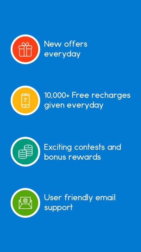 Aplikasi mengisi ulang gratis ini bekerja pada satu aturan sederhana - Dapatkan uang dengan men-download aplikasi. Itu berarti Anda mendapatkan kredit gratis setelah men-download aplikasi yang Anda inginkan. Dan juga, bermain kuis atau menonton video untuk mendapatkan saldo bebas. Yang sederhana dan mudah. Tanpa kerumitan, Anda dapat mengisi ulang ponsel Anda atau menggunakan kredit untuk DTH top-up.