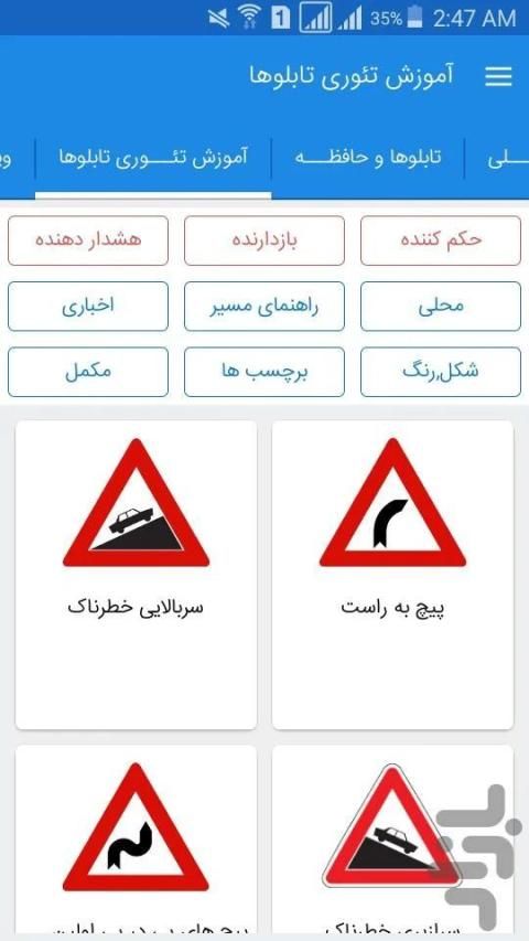 در این بخش تابلو ها وعلائم رانندگی را به صورت گروه بندی شده در دسته های خاص فرا میگیرید.