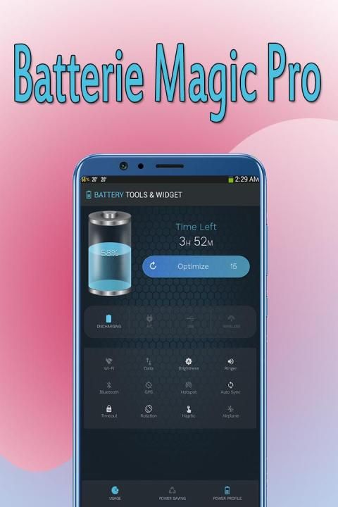 Saver Battery memungkinkan Anda menyesuaikan mode hemat daya Anda (seperti mengaktifkan atau menonaktifkan Wi-Fi dan kecerahan layar) untuk menghemat lebih banyak waktu dalam penggunaan jangka panjang.