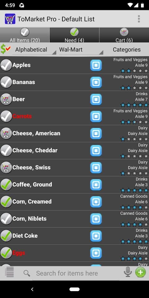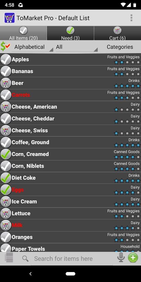 Voice Recognition – Search for items on your list and easily move it to need or cart. Add items by saying "NEED apples AND oranges AND bacon" or "ADD bacon"
