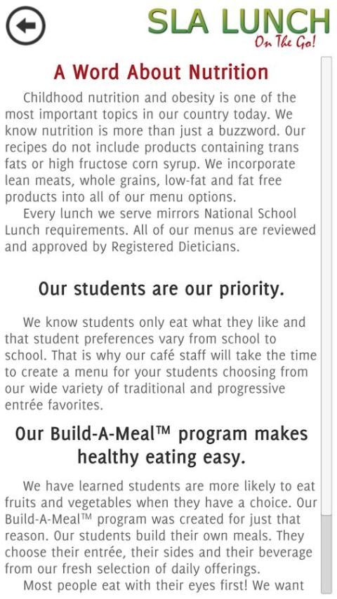 Aplikasi utama untuk mengelola pengalaman makan siang di sekolah Anda! Benar-benar memantau dan memelihara account makan siang dengan meninjau semua transaksi dan menyetorkan dana dari telapak tangan Anda. Membuat keputusan siang informasi nyaman dengan akses penuh ke menu yang akan datang. Lihat informasi gizi saat menggunakan pilihan alergen filtering baru kami untuk membantu dalam menentukan potensi alergen untuk setiap item menu. Luangkan waktu sebentar untuk membaca tentang Harvest kami dari Bulan untuk musiman, produk lokal. Tetap sepenuhnya terhubung ke pengalaman ruang makan anak-anak Anda dengan SLA Lunch On The Go!