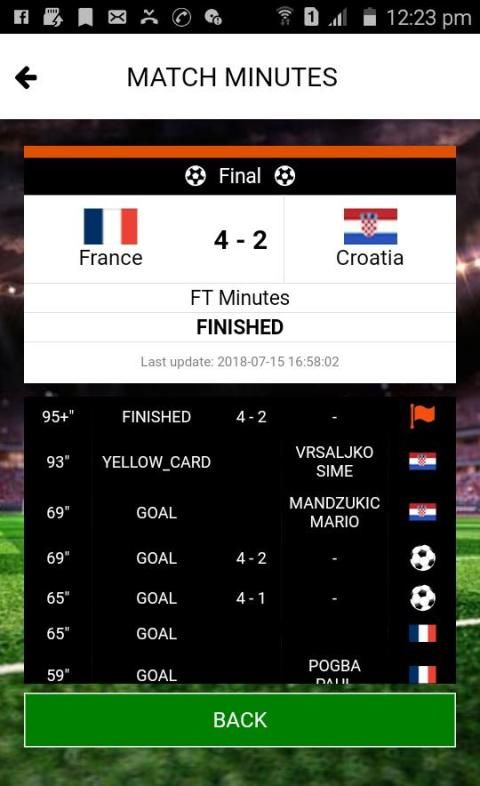 From the match Kick Off, throughout the match (Goals, Cards, Other events) this app will inform you every Match Minutes in real time.