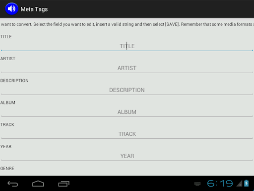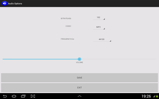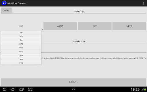 versi aktual dari video Konverter untuk Android mendukung format output berikut: AAC, AC3, FLAC, M4A, MP2, MP3, OGG, WAV, WMA. Rentang file input sebagai gantinya mencakup lebih banyak format, hampir semua jenis file multimedia. Konverter video MP3 dapat mengidentifikasi arsitektur CPU ponsel / tablet Anda untuk menginstal paket codec yang tepat (dan gratis) dan untuk memberi Anda pengalaman konversi terbaik.