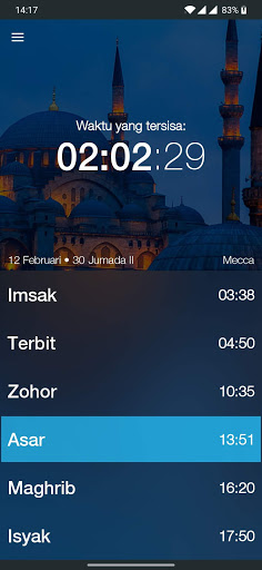• Arah Kiblat - menunjukkan arah kiblat dari lokasi yang Anda pilih. Kami tidak memerlukan izin untuk lokasi Anda karena itu dipilih oleh Anda dari pengaturan.