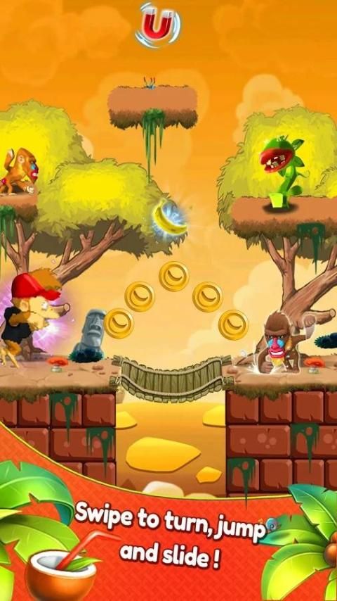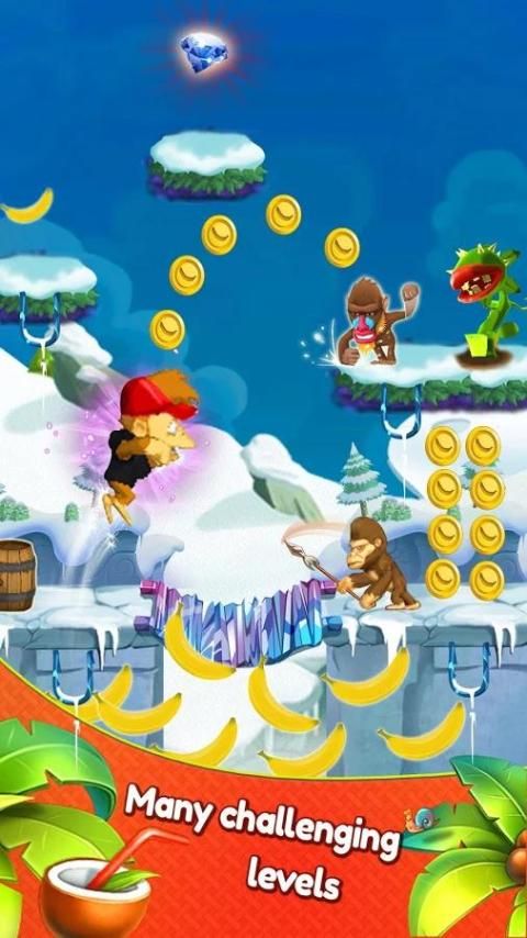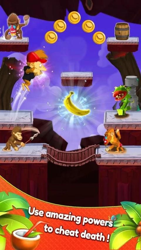 Terbang dari pohon anggur untuk pohon anggur, tapi hati-hati untuk bahaya mengintai di hutan. Dapatkan pisang untuk mendapatkan upgrade, spesial dan power up