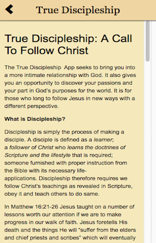The True Discipleship App seeks to bring you into a more intimate relationship with God. It also gives you an opportunity to discover your passions and your part in God’s purposes for the world. It is for those who long to follow Jesus in new ways with a different perspective.