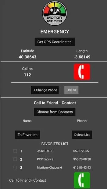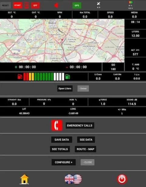 We have screens of Totals, Data, Emergency Calls, Routes and Maps, a nice GPS Free that tells us many more data than a conventional gps, User Data, Message Center and as Extras: Consumer Calculator, How to make the Running of our engines, Converter and a great Compass. We will be able to download the data in File. CSV (Excel) and routes in Files. KML (Google Map) and give you many different ways and options.