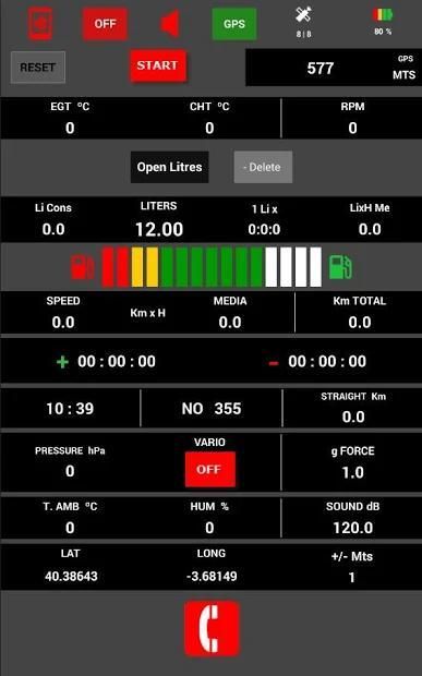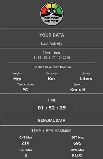 The Motor Meter is an application for Mobile and Tablet (in Android) that with sensors installed in our engine and connected by Bluetooth with the switchboard, we will indicate data of: EGT (exhaust gases temperature), CHT (cylinder head temperature-spark plug), H2O ( Water Research temperature-refrigerant), RPM (revolutions per minute), Fuel consumption (liters consumed, liters in tank, time consuming 1 litre, liters per hour of average, Fuel marker by colors, Current Speed, Average Speed, Total distances, Straight line distances, positive Chronometer (the time we take), negative Chronometer (the remaining time according to fuel in the tank), GPS or Sensor Heights, accumulated Heights, Pressure, Variometer, Force g meter, Ambient Temperature and Humidity, Sound meter, Coordinates and extra Data.