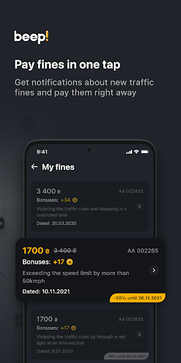 Periksa / diberitahu tentang denda lalu lintas dan membayarnya segera di aplikasi. Anda dapat mencari denda dengan dokumen atau jumlah pemberitahuan denda. Data tentang denda baru akan muncul dalam aplikasi dalam waktu 2 jam setelah pelanggaran.
