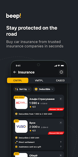 beli wajib (cmtpl), asuransi mobil sukarela (vmtpl) atau casco dalam 5 menit tanpa mengunjungi perusahaan asuransi. Polis asuransi Anda akan selalu tersedia di ponsel Anda. Kami juga akan mengingatkan Anda untuk memperbarui kebijakan 30 hari sebelum berakhir.