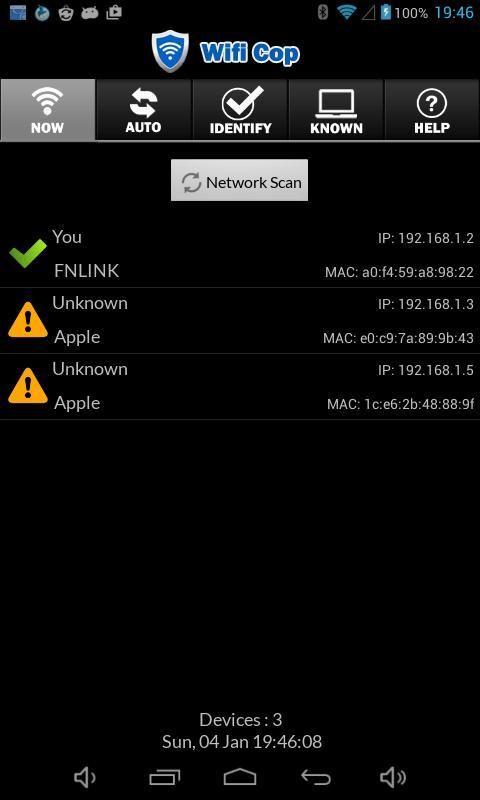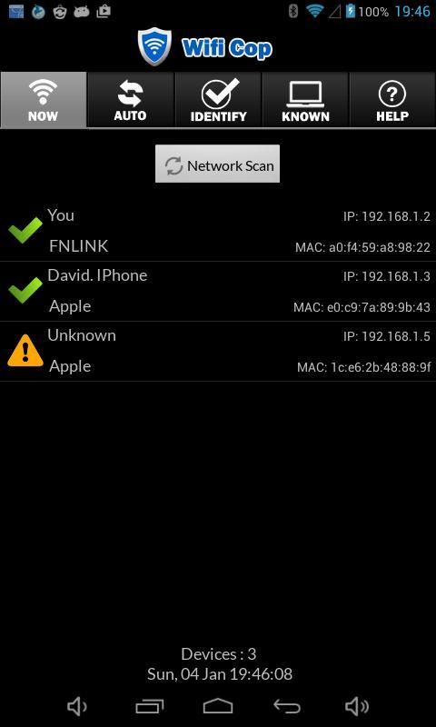 Jika perangkat baru terhubung ke Wifi Anda, WifiCop pencarian dalam database-nya. Jika tidak diketahui, itu alarm dan Anda dapat mengidentifikasi atau curiga bahwa ada penyusup dan melakukan tindakan lebih lanjut.