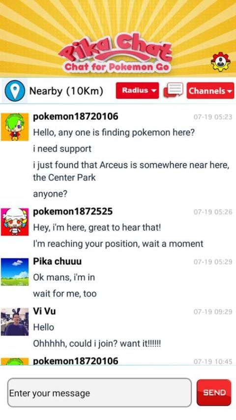 Dalam Go Komunitas, Anda dapat chatting dengan pelatih lain dari mana saja. Pelatih dapat chatting dengan lingkungan mereka, seorang guru di negara yang sama. Anda dapat menggunakan bahasa asli Anda sendiri untuk chatting, berbagi pengalaman dan meminta nasihat dari pelatih Pokemon Go lainnya di negara Anda. Pelatih bisa pergi global dengan melompat ke kamar global seperti Tim Valor, Tim Mystic, Tim Instinct. Anda dapat meminta lainnya Pokemon Go pelatih apa-apa dari bagaimana melatih pokemon bagaimana Anda dapat menetas telur untuk membela gym.
