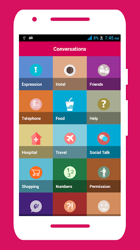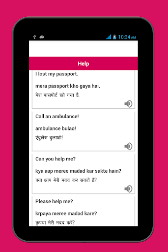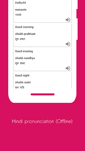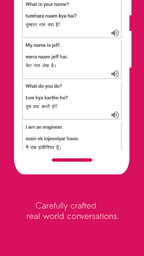 You will get Hindi audio pronunciation of each conversation. So you can hear what you are learning. The app can also be helpful to foreigners who are on a visit to India as tourists, and scholars.