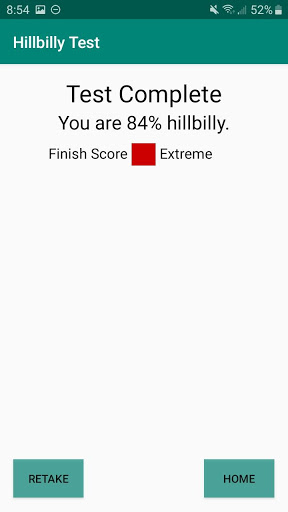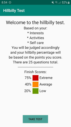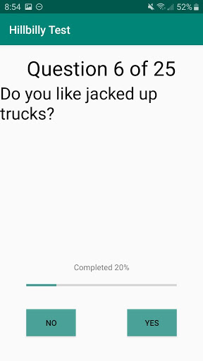This will run you through 25 questions that are related to things that hillbillies do or enjoy. After you answer all 25 questions your hillbilly percentage will be displayed as either Low(not much of a hillbilly), Average(Average hillbilly) or Extreme(stereo typical hillbilly.)