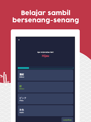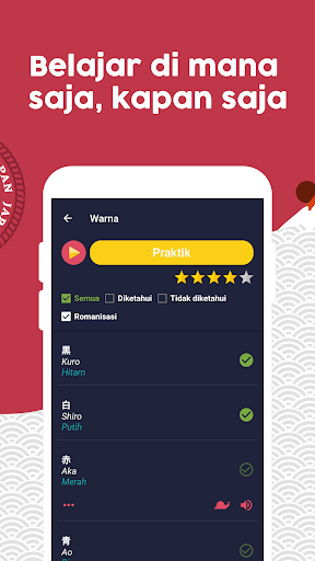 + Belajar bahasa Jepang dengan cara yang menyenangkan dan cepat: Belajar sambil bersenang-senang, aplikasi ini dikembangkan dalam bentuk permainan untuk belajar bahasa Jepang dengan cepat dan mudah.