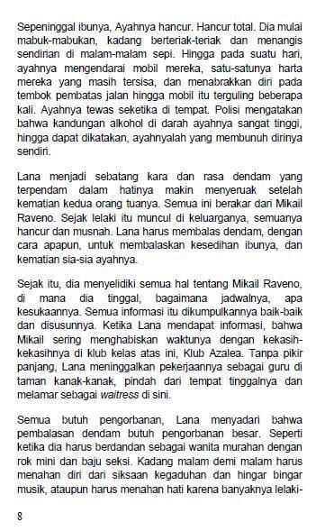 Mereka berdua meninggalkan Lana Sendirian, sebatang kara di dunia ini. Sendirian di dunia ini, Lana menyadari bahwa penghancur hidup keluarganya, yang menjadi pembunuh tak langsung kedua orang tuanya adalah Mikail Raveno, Pria berdarah italia, penguasa bisnis yang punya hobby menghancurkan dan menguasai perusahaan-perusahaan kecil yang dia incar, termasuk perusahaan orang tua Lana. Kehidupan keluarga mereka sebenarnya baik-baik saja sebelum Mikail Raveno masuk dan merusak semuanya. Entah apa yang dilakukan oleh lelaki itu kepada perusahaan ayahnya, yang Lana yakini, lelaki itulah yang menjadi penyebab utama dia kehilangan kedua orangtuanya.