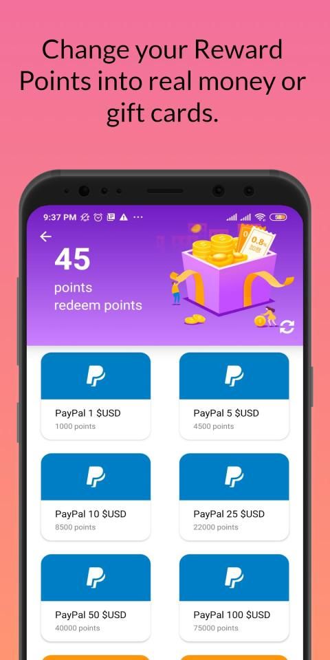 Aplikasi Poin Cash gratis membayar lebih baik dan lebih cepat daripada aplikasi hadiah lainnya! Tidak ada kartu hadiah atau diskon, Anda dibayar TUNAI di akun PayPal Anda! Dijamin pembayaran super cepat.