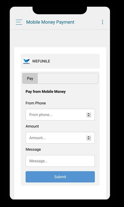 Aplikasi ini memungkinkan Klien Wefunile untuk melacak pembayaran mereka secara realtime, juga didukung oleh TRANSPAY sehingga orang dapat melakukan pembayaran dengan mudah dari Uang Seluler.