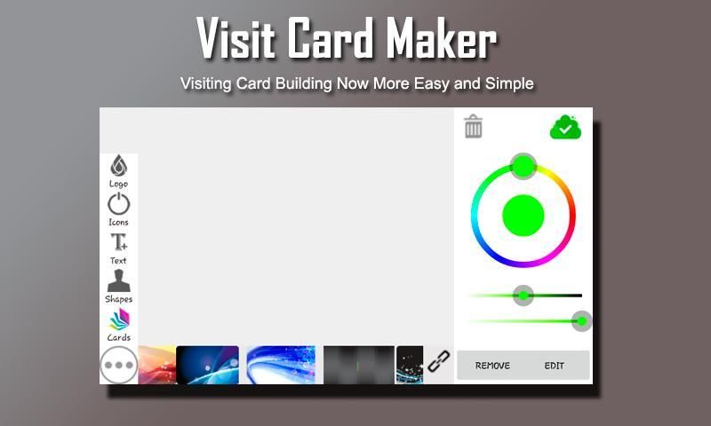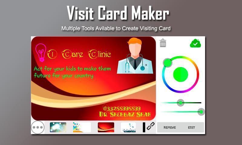 Bisnis atau kartu Mengunjungi merupakan bagian dari identitas business.And Anda sekarang kami memberikan Anda aplikasi fantastis dengan mana Anda dapat membuat kartu dengan ponsel pintar Anda sekarang tidak perlu untuk pergi untuk printer atau desainer menggunakan aplikasi ini gratis Anda dapat membuat layout seperti yang Anda mau, membuat sendiri mengunjungi, kartu tamu Anda dan memberikan kepada manusia printer untuk printing.it adalah aplikasi terbaik untuk setiap pengusaha yang membuat kartu nama di menit ia menciptakan kartu digital profesional untuk bisnis Anda. Anda dapat membuat, menyimpan dan berbagi kartu nama Anda pada jaringan media sosial atau melalui email ke teman, keluarga, mitra bisnis, klien, pelanggan atau siapa pun yang Anda ingin
